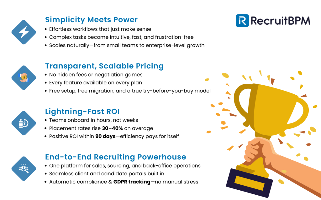 Simplicity combined with power distinguishes RecruitBPM fundamentally. Transparent pricing without hidden fees sets it apart. Implementation happens within hours rather than months.