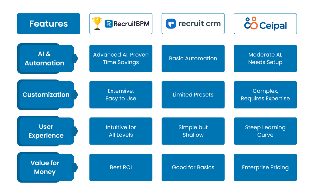Before diving deep, let’s see how these platforms stack up. RecruitBPM emerges as the clear winner for most agencies. Recruit CRM offers simplicity for smaller teams. Ceipal serves enterprises with complex needs.
