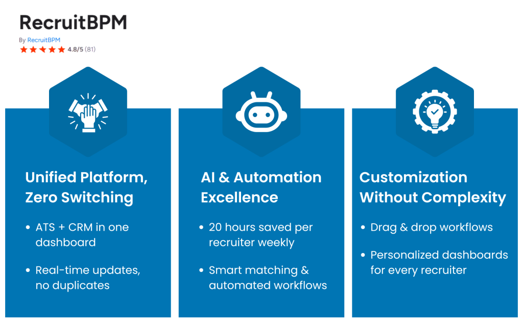 - RecruitBPM: All-in-one platform with 20-hour weekly time savings