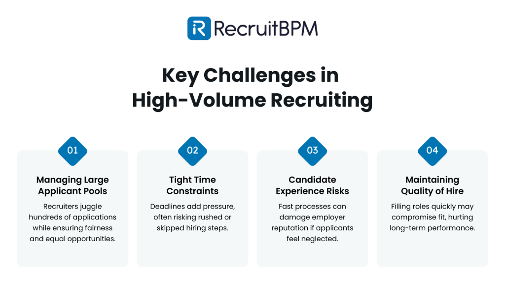 Speed pressures often compromise hiring standards during volume recruiting. Rushed decisions lead to poor cultural fits. Inadequate screening results in performance issues. High early turnover indicates quality problems.