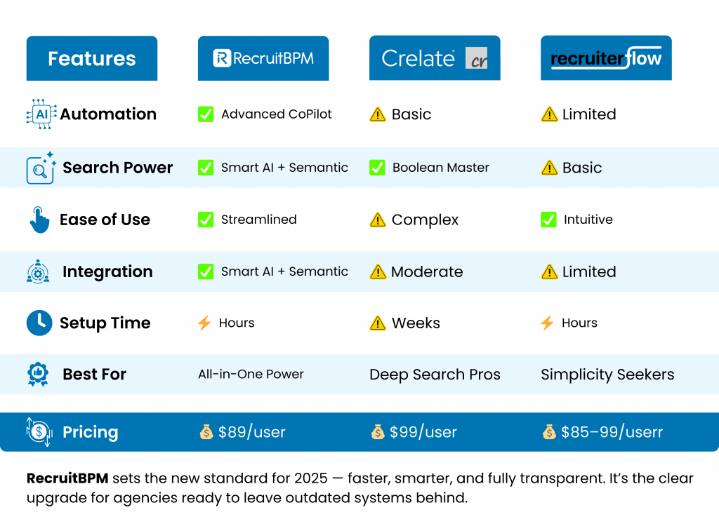 RecruitBPM emerges as the superior choice for most agencies. The platform balances powerful features with exceptional usability brilliantly. Value proposition exceeds competitors across every meaningful dimension.